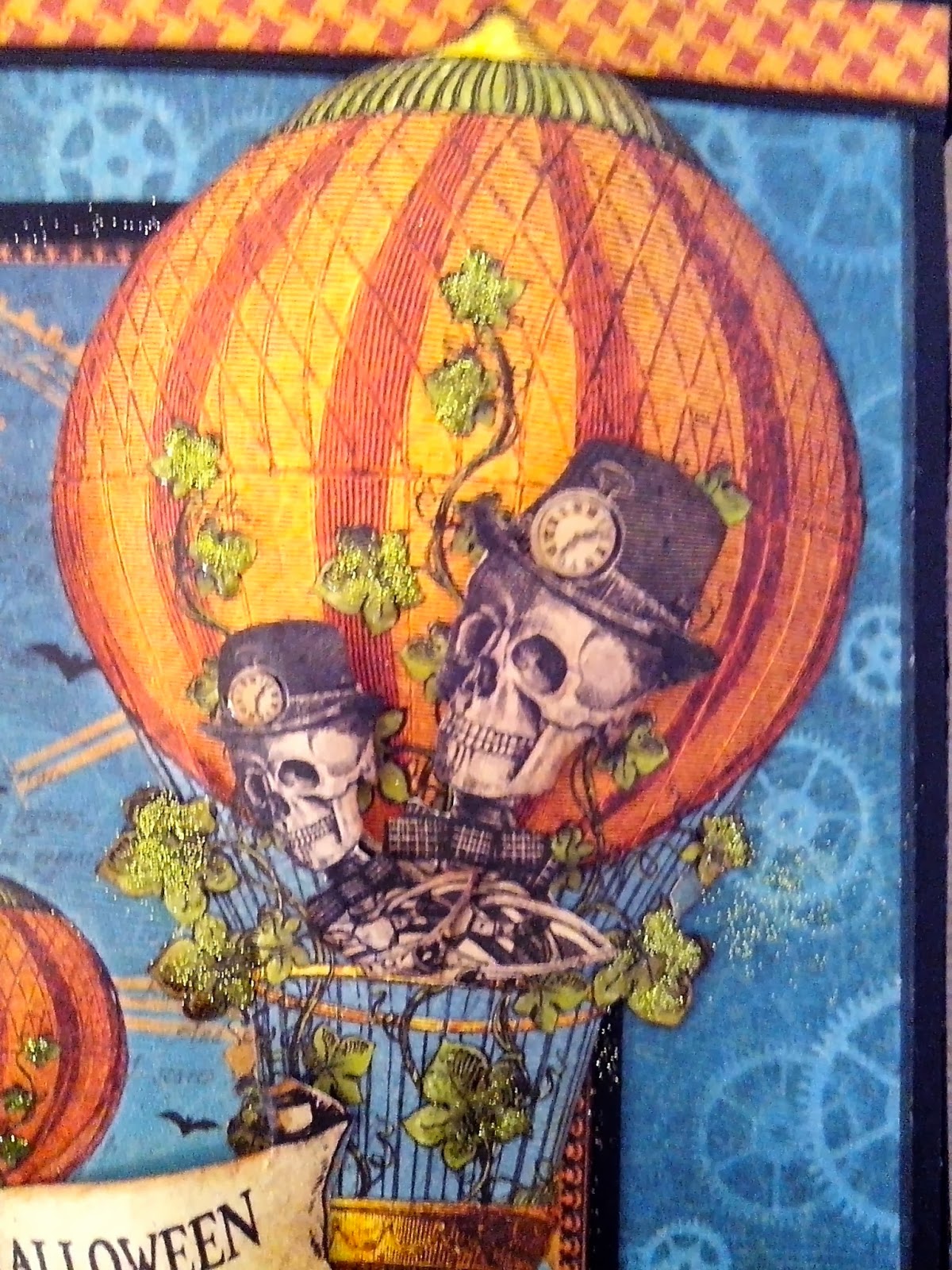Then I made the decoration on the front from the Happy Halloween cut apart, a couple of pumpkins and two Seymore Bones from the 12 x 12 and 8 x 8 papers. I trimmed down the cut apart, cut out the sentiment and repositioned the bottom border under the pumpkins, then I shaped the two pumpkins with a ball tool to give them some dimension, added Mr & Mr Seymore Bones to the large basket with some pop dots and then stuck the pumpkins down over the ones on the cut apart. Then I mounted the piece on black card and stuck it to the front of the bag over the blue background paper.