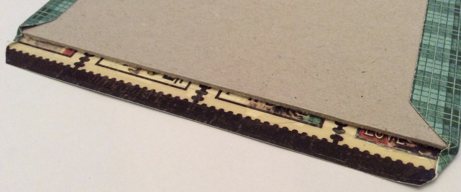 5. Push paper triangles in towards the middle of the short edge to cover chipboard corners and then fold and stick short paper edges down onto chipboard.